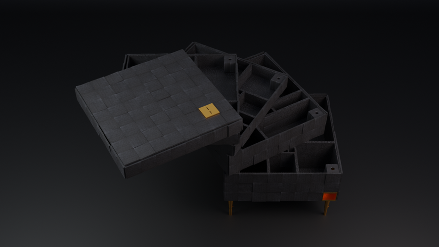 When closed it looks like a small stool, that you decide on where you want to place it within your own home. Each Japanese blackened wood layer doesn’t show at first it’s Fibonacci’s layered drawers inside of it. Each drawer from bottom to top increasing in size. On top there’s are two coin-slots one of them to open it up and one of them to even close it in the same principle.